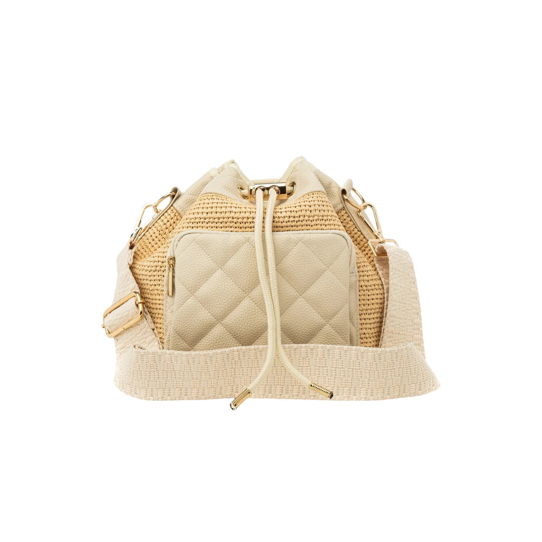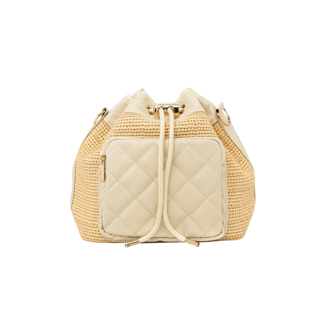 Raffia Bucket Bag with Pebbled Beige Vegan Leather Trim