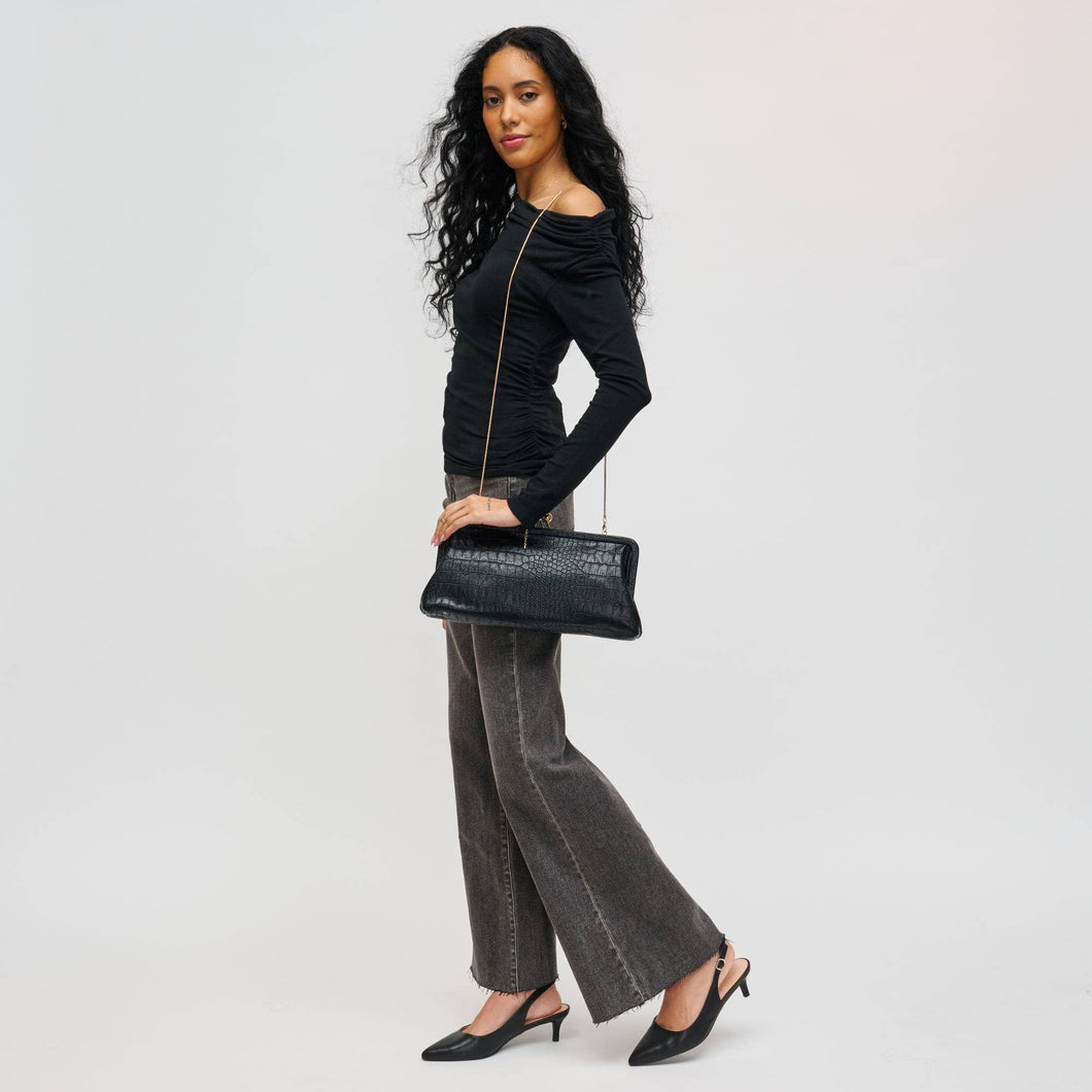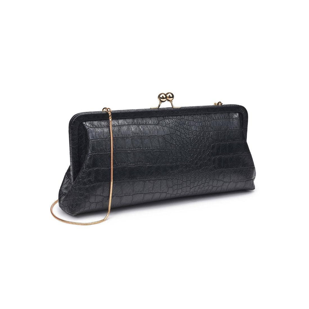Features interior slip pocket, detachable chain strap for shoulder / crossbody wear and a kisslock closure.