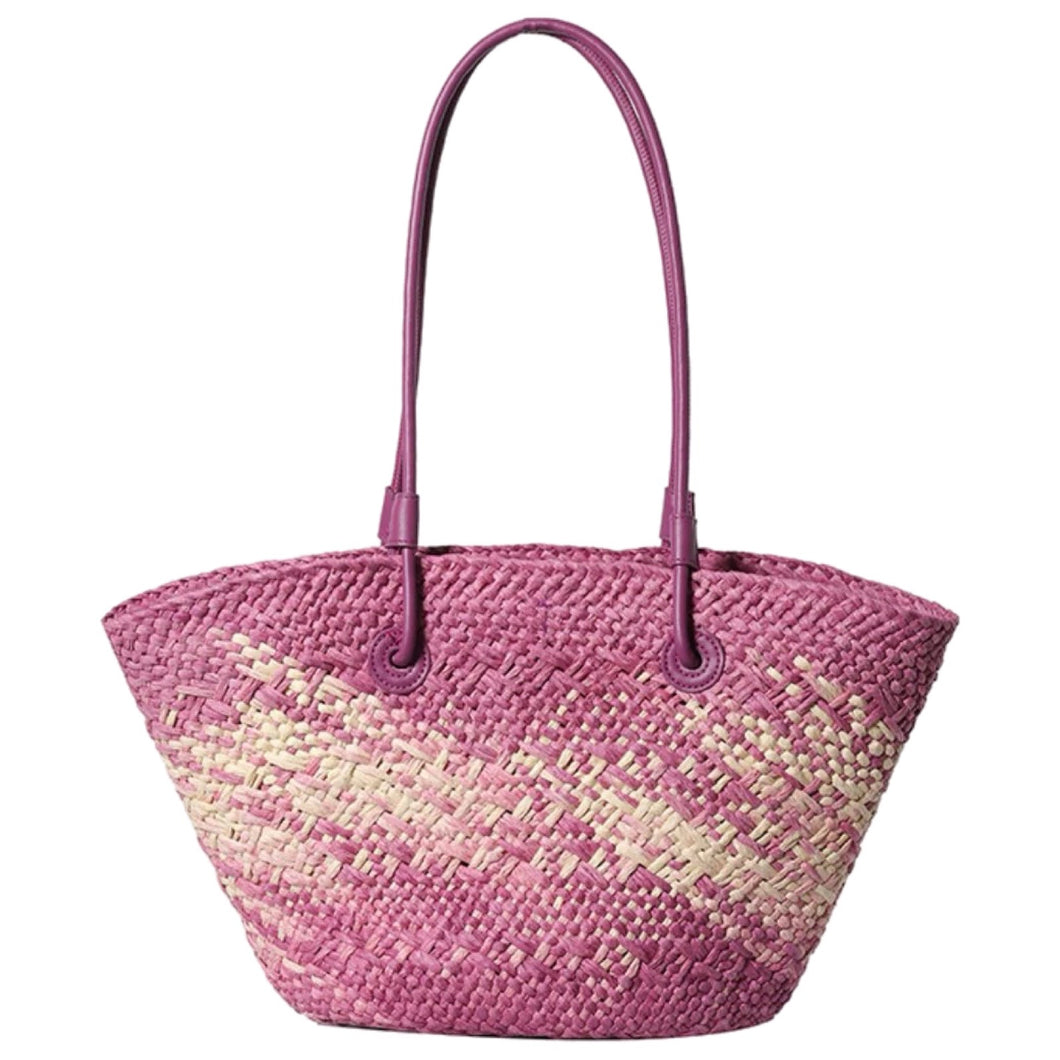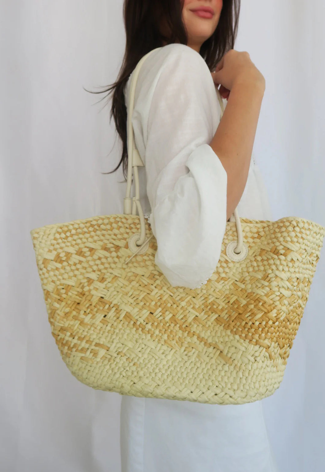 Tan & Ivory Straw Tote with Faux Leather Shoulder Straps