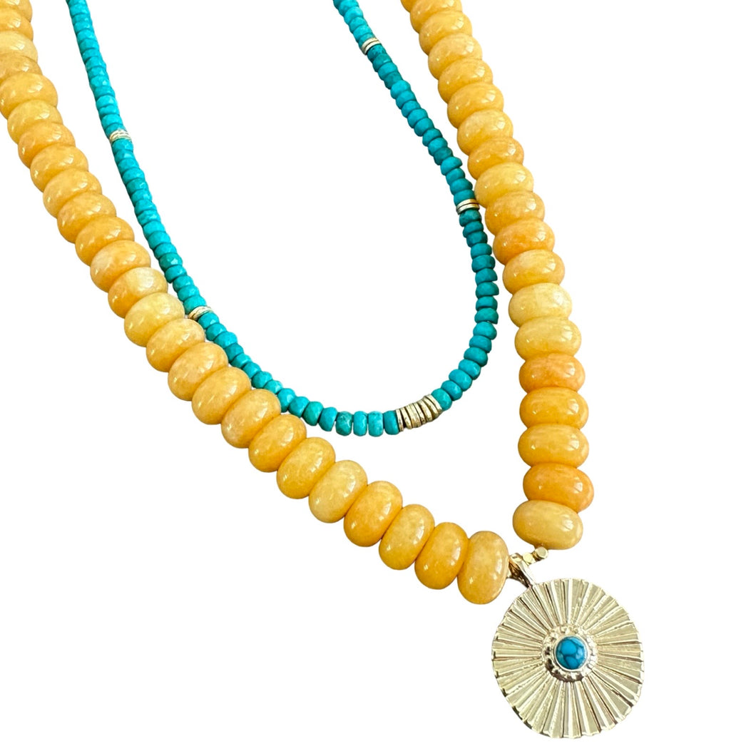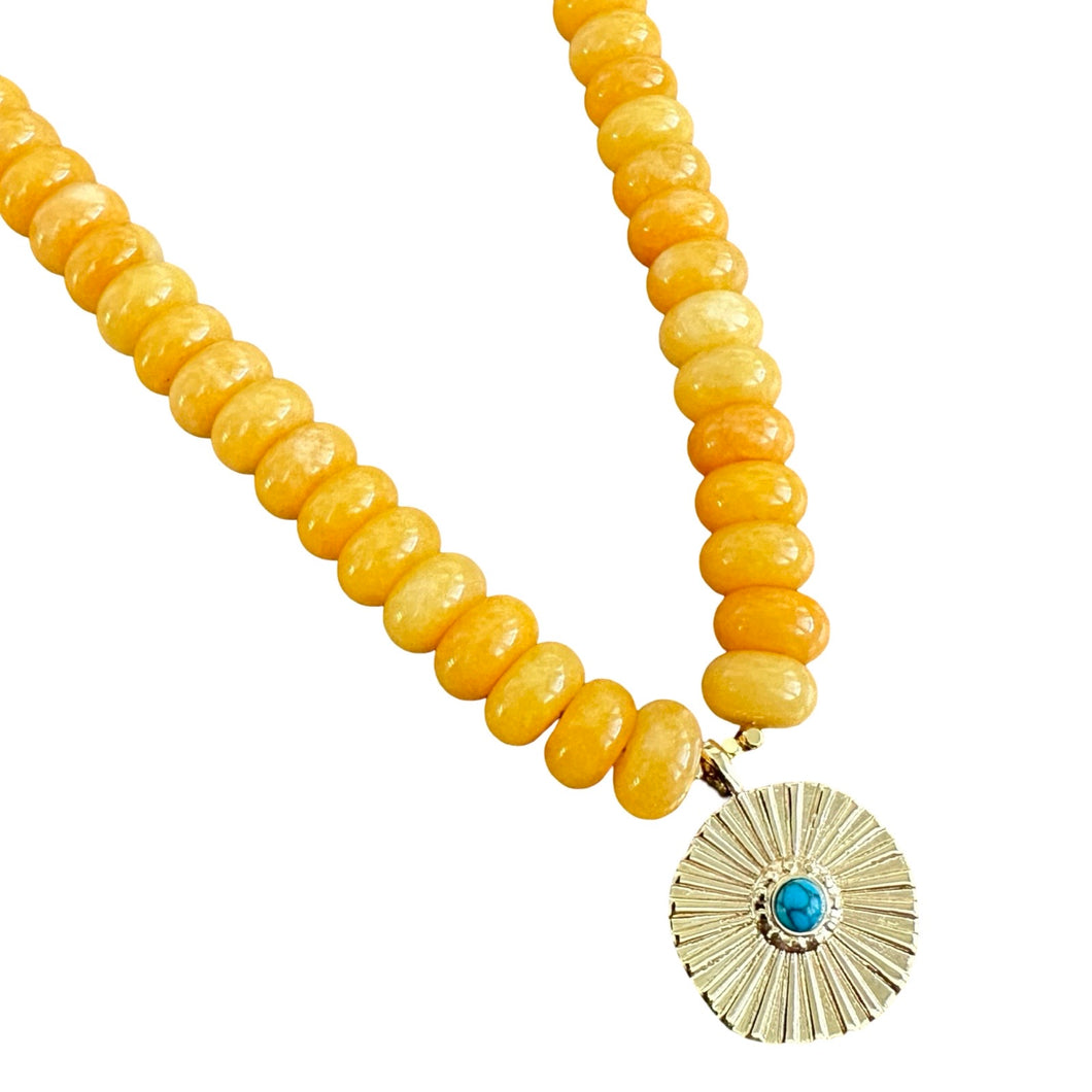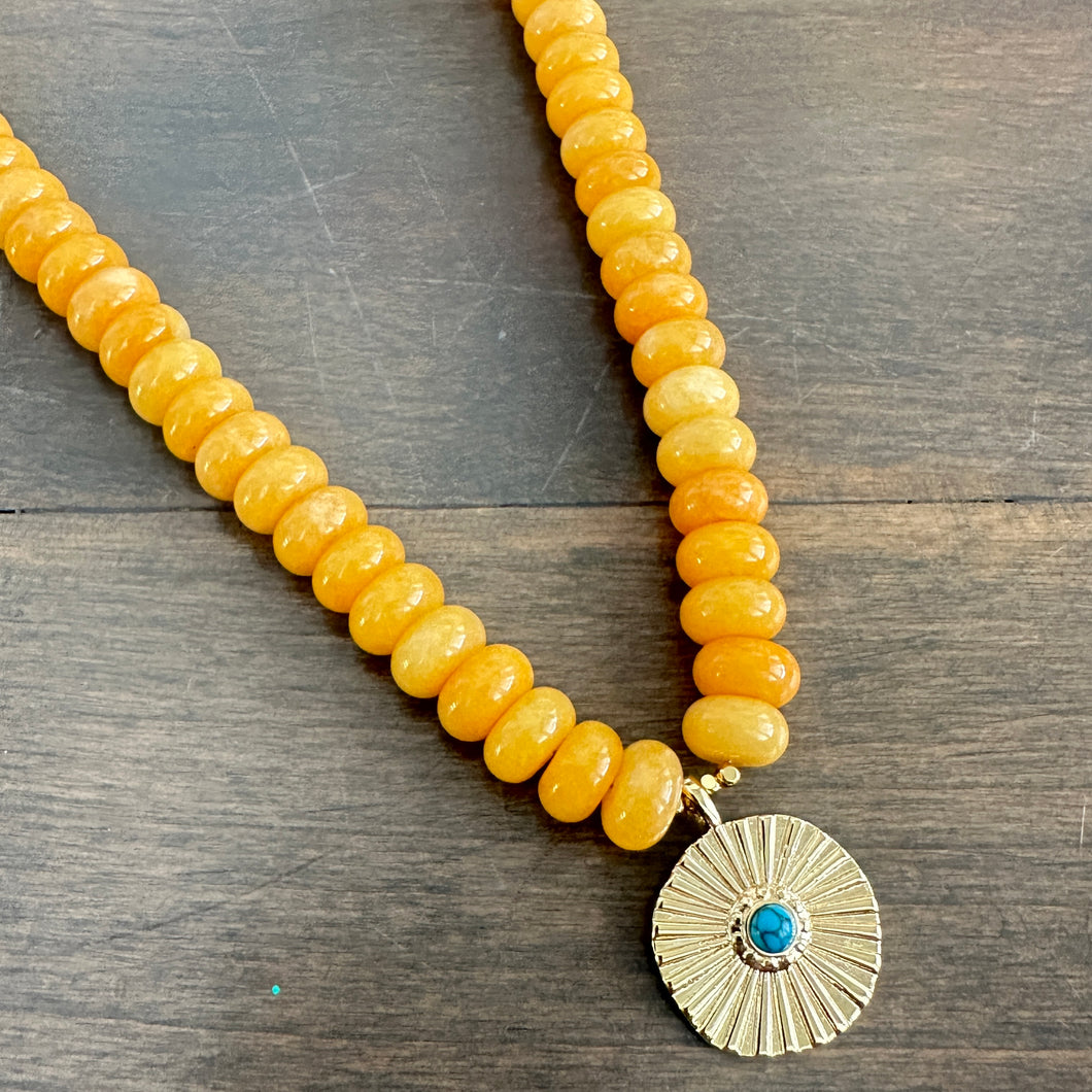 16” 10mm Mustard Jade Necklace with Bezeled Turquoise Detailed Gold Disc Pendant