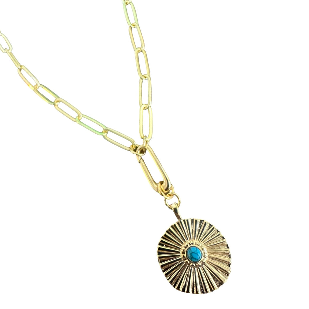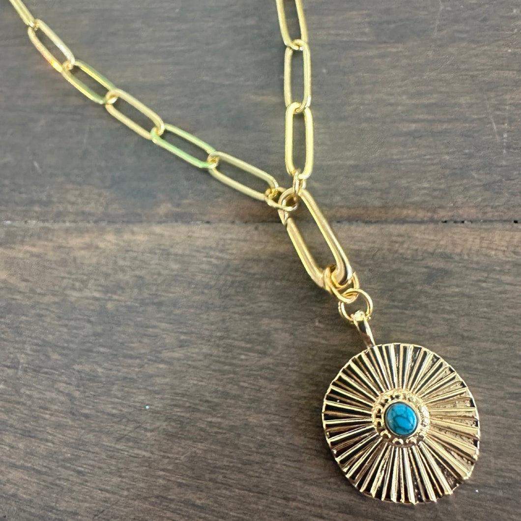 17" Paperclip Chain "Y" Necklace with Bezeled Turquoise Fluted Gold Pendant