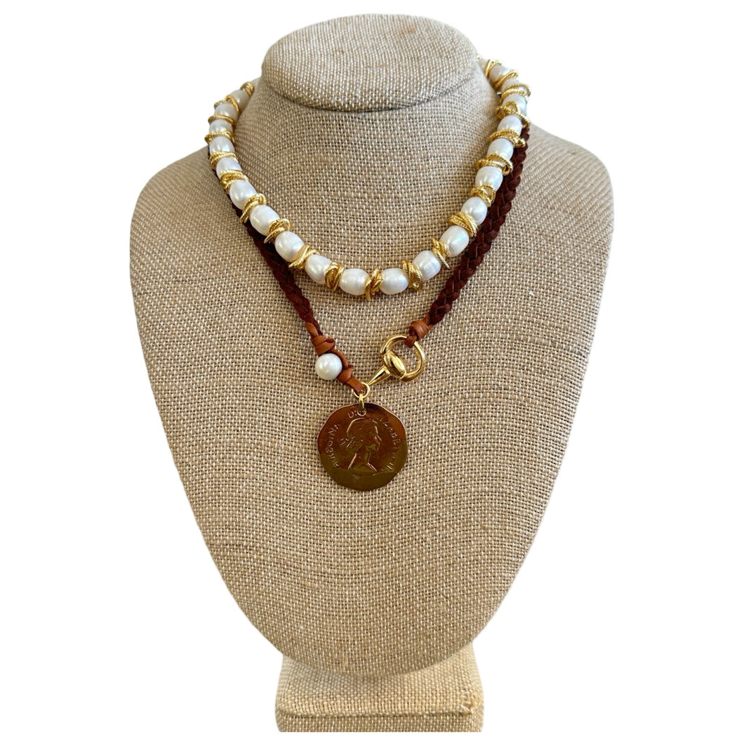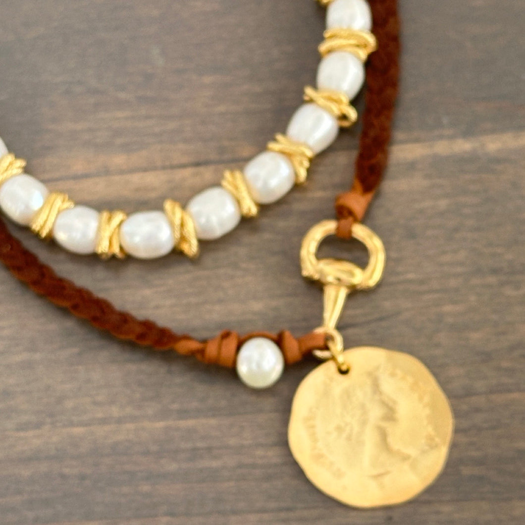 16" Braided Leather Necklace with Horsebit & Pearl Detail and Coin Drop