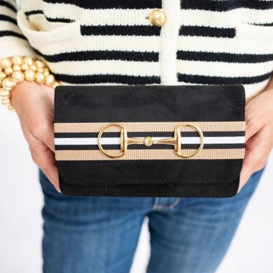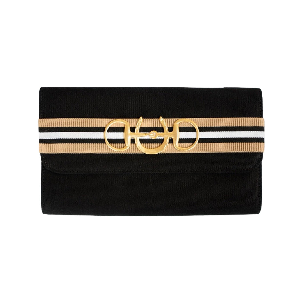 Black Clutch with Horseshoe, Snaffle and Stripe Ribbon Detailed Flap