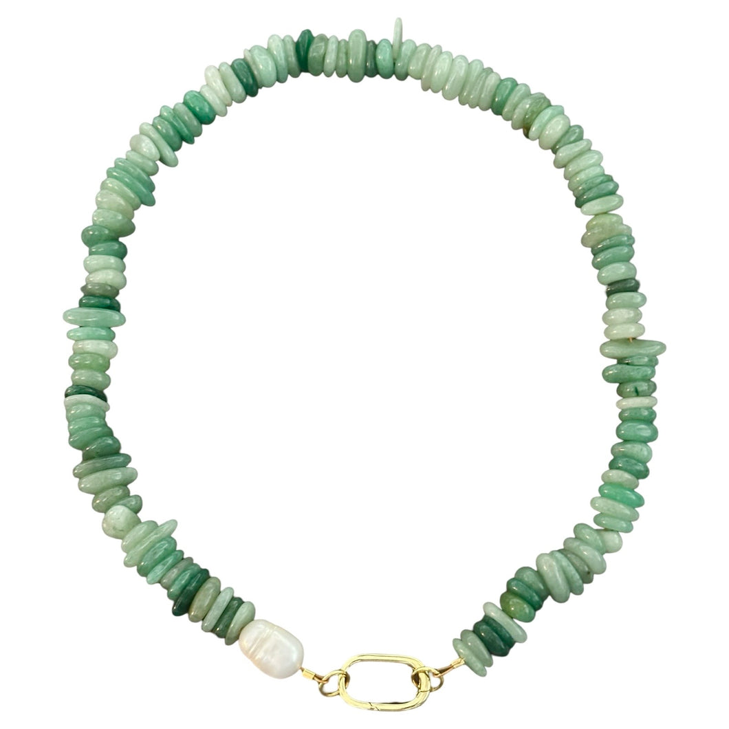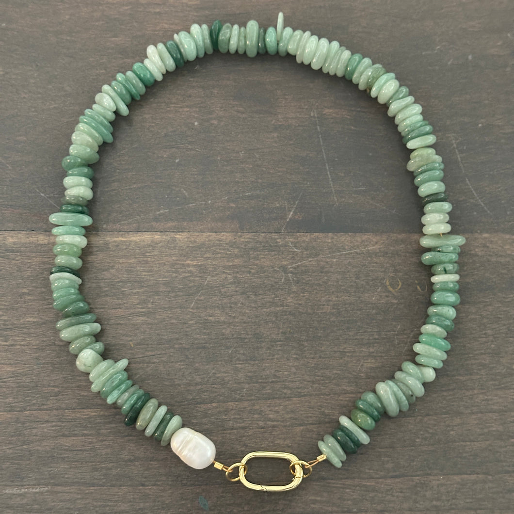 15-17" Aventurine Chip Necklace with Pearl Accent and Carabiner Closure