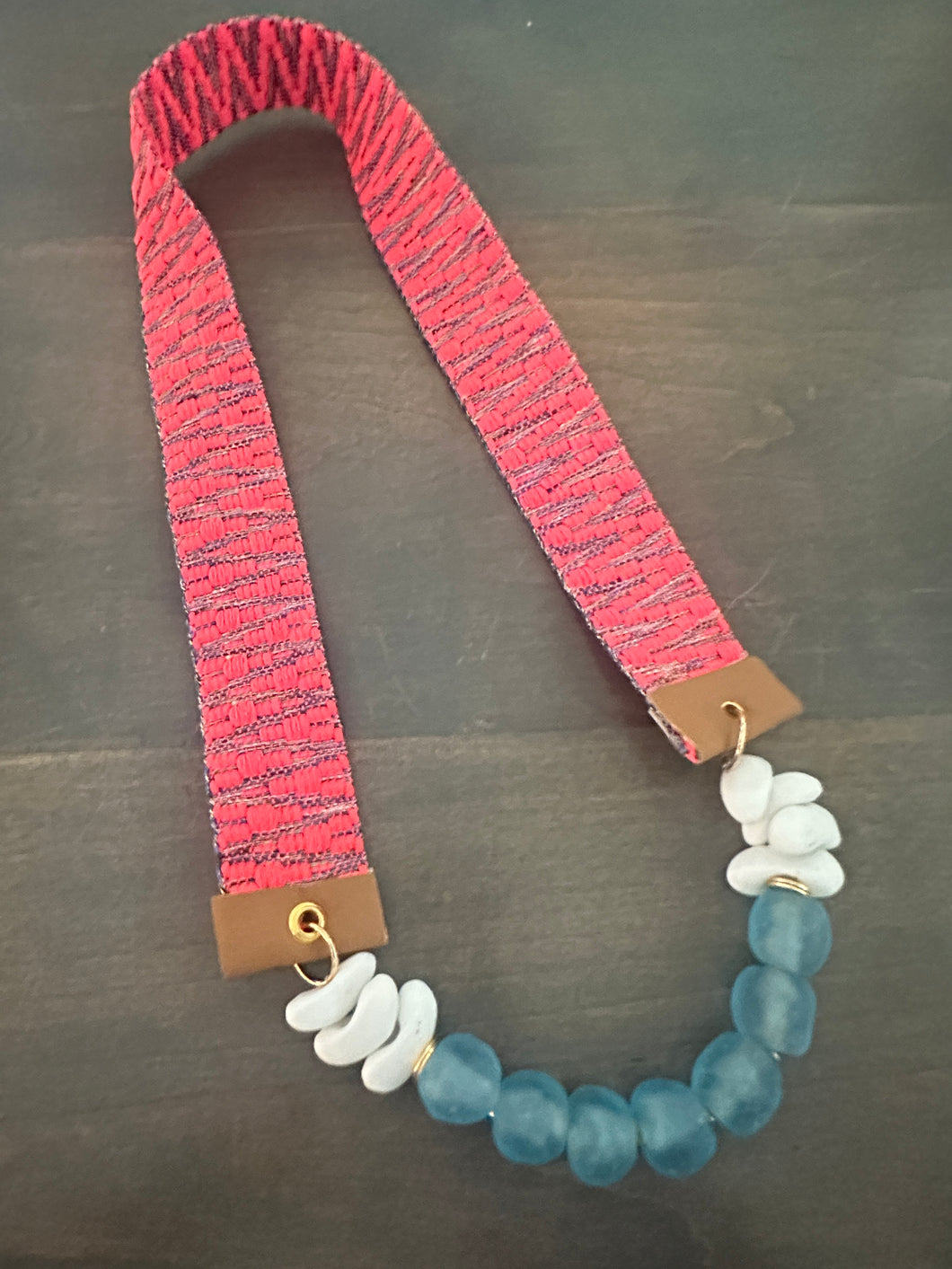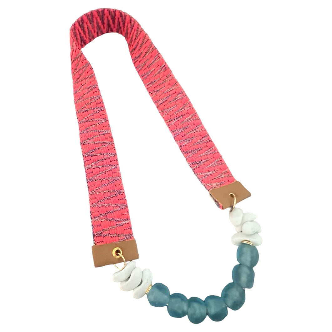 28" Hot Pink Jacquard Strap with Blue Sea Glass and White Beads