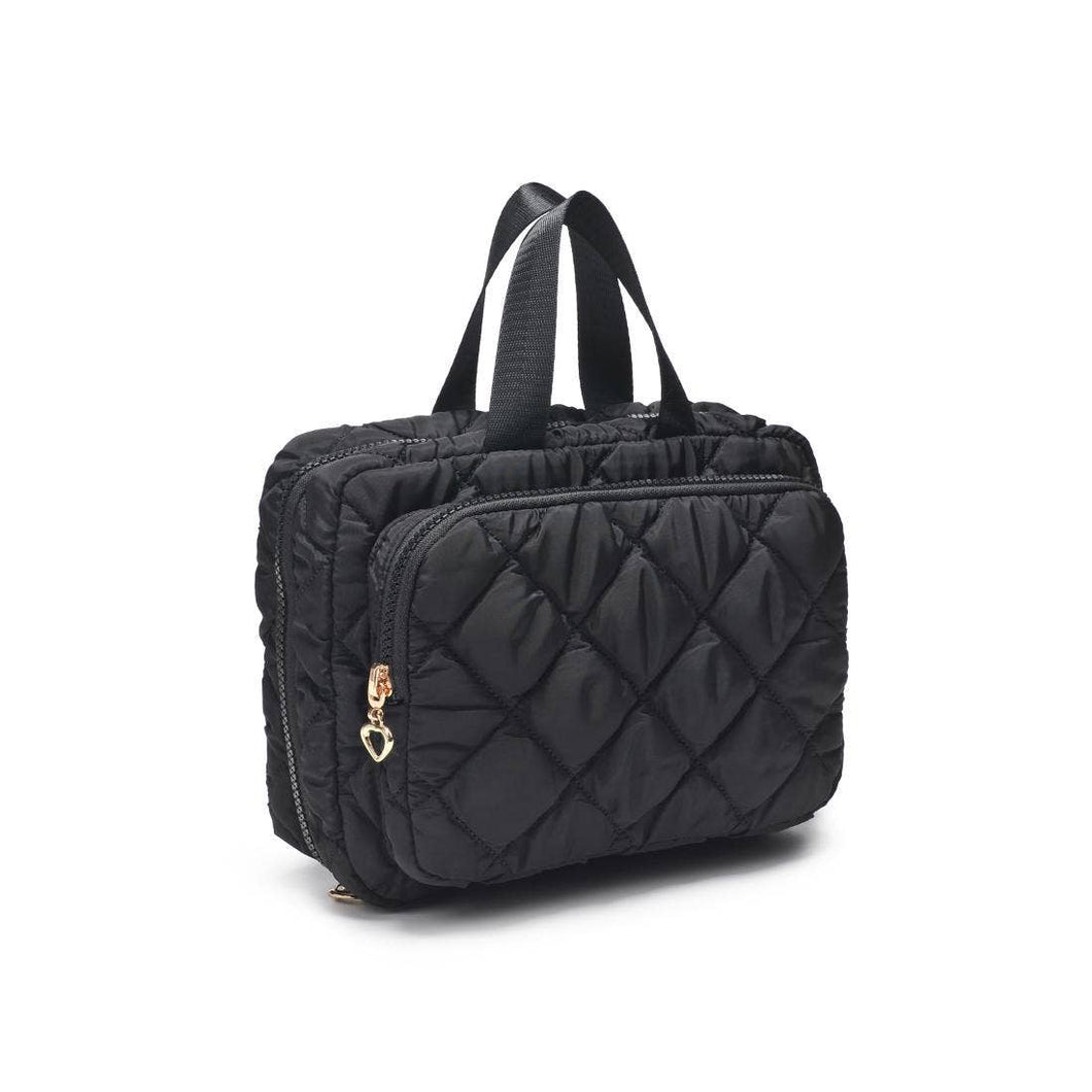 Features a zippered closure, an exterior pocket and a divided interior with multiple pockets for storage and organization.